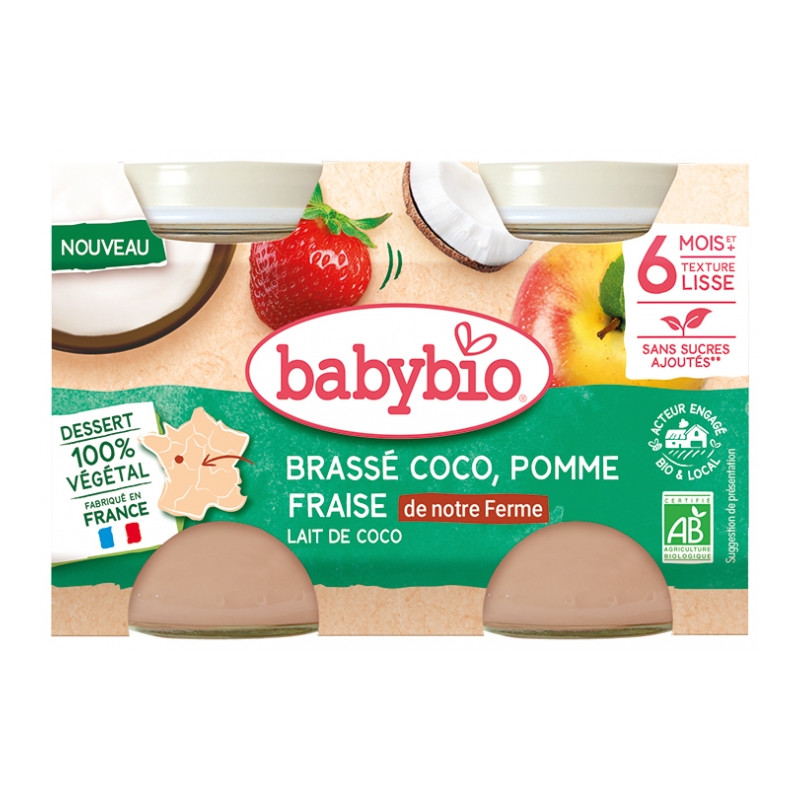 Babybio Brassé Coco Pomme Fraise Lait de Coco 6 Mois et + Bio 2 Pots de 130 g est un délicieux dessert végétal à base de fraises cultivées avec soin dans nos fermes.