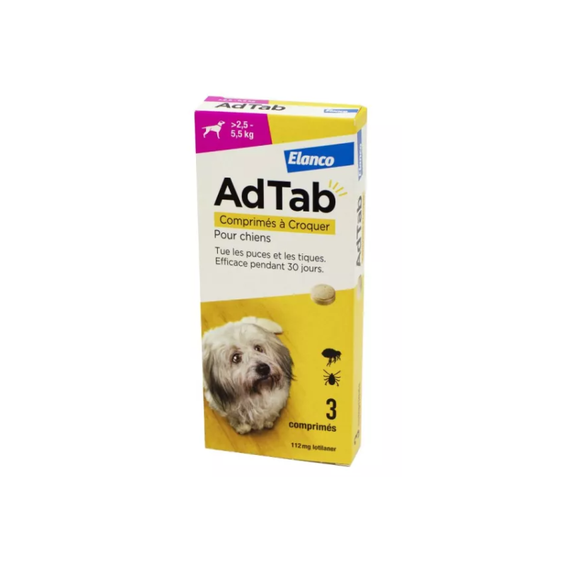 AdTab intervient dans le traitement des infestations par les puces et les tiques chez les chiens. Ce médicament assure une activité insecticide sur les puces et une activité acaricide sur les tiques immédiate et persistante.