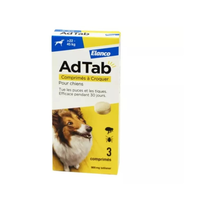 AdTab intervient dans le traitement des infestations par les puces et les tiques chez les chiens. Ce médicament assure une activité insecticide sur les puces et une activité acaricide sur les tiques immédiate et persistante.