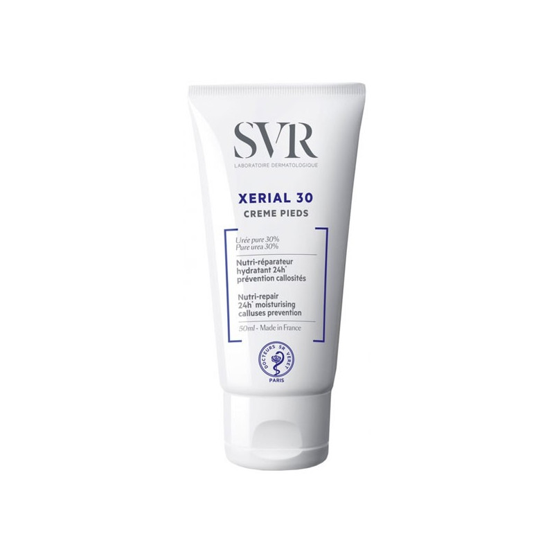 SVR Xérial 30 Crème Pieds 50 ml nourrit et adoucit la peau des pieds très secs et abîmés, répare et prévient l'apparition des callosités. Avec sa technologie Urée Pure à 30%, elle réduit l'aspect sec et abîmé de la peau. Enrichie en Beurre de Karité, en Allantoïne et Vitamine B5, cette crème protège et hydrate la peau pendant 24H. Sa texture est légère pour une pénétration rapide. Sans parfum et sans paraben. Testé sous contrôle dermatologique et podologique.