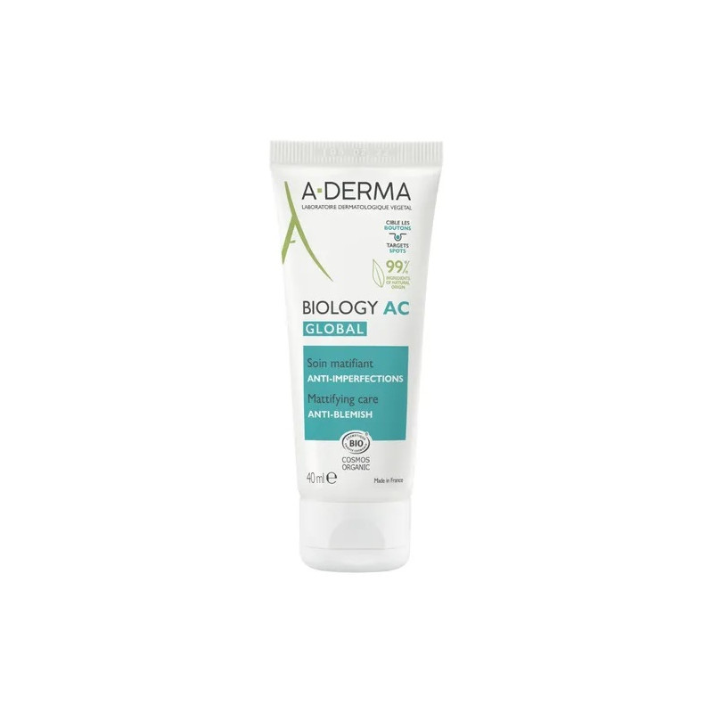 Le Soin Matifiant BIOLOGY AC GLOBAL d'A-Derma est une crème hydratante anti-imperfections (boutons et points noirs) et anti-marques rouges et brunes qui désincruste les pores, prévient la récidive et rééquilibre le microbiote.