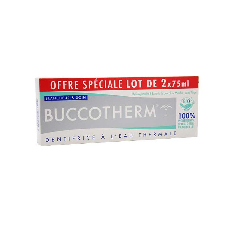 Buccotherm Dentifrice Blancheur et Soin Lot de 2 x 75ml est un lot de dentifrices composés à base de 99 % d'ingrédients d'origine naturelle.