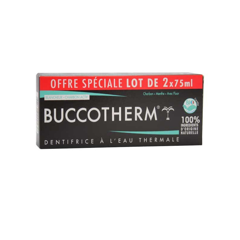 Buccotherm Dentifrice Blancheur Charbon Lot de 2 x 75ml est un lot de dentifrices composés d'ingrédients d'origine naturelle.
