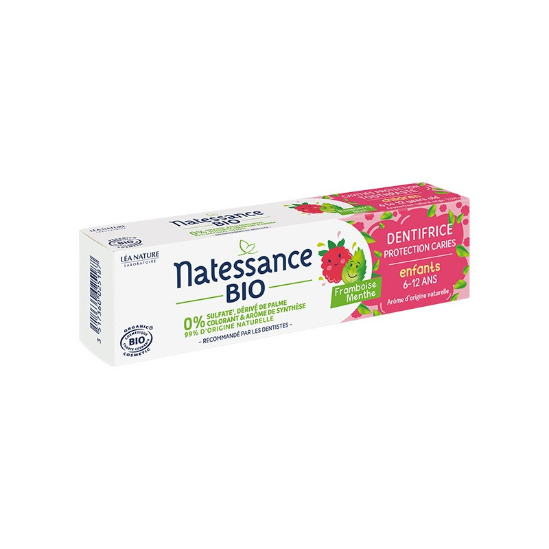 Le nouveau dentifrice enfants (6-12ans) Natessance à l'arôme de framboise et Menthe permet une triple action: