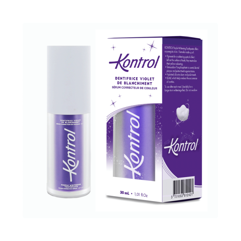 Innovation Unique ? : Le Dentifrice Violet de Blanchiment Kontrol révèle un sourire éclatant avec sa formule 4-en-1, combattant efficacement les taches pour des dents plus blanches. ?