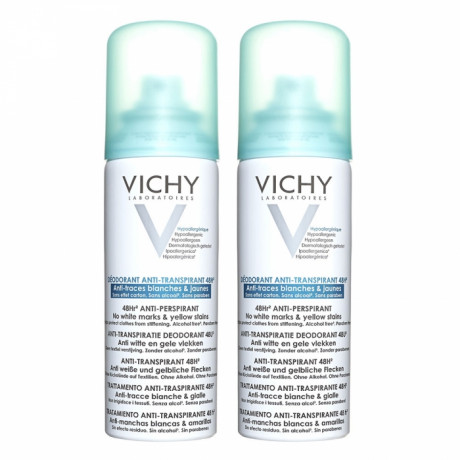 Vichy Déodorant Anti-Transpirant Anti-Traces Aérosol 48H Lot de 2 x 125 ml régule durablement la transpiration tout en laissant respirer la peau.
