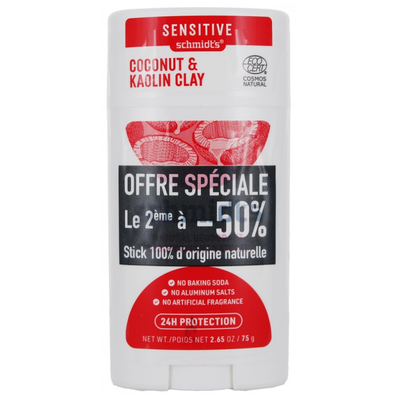 Schmidt's Sensitive Déodorant Stick Naturel Noix de Coco et Argile Kaolin Lot de 2 x 75 g est un duo de déodorant efficace et 100% d'origine naturelle, sans sels d'aluminium et sans bicarbonate de soude pour plus de douceur.