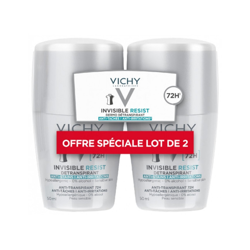Vichy Déodorant Invisible Resist Dermo-Détranspirant 72H Roll-On Lot de 2 x 50 ml est un déodorant détranspirant, anti-taches et anti-irritations.