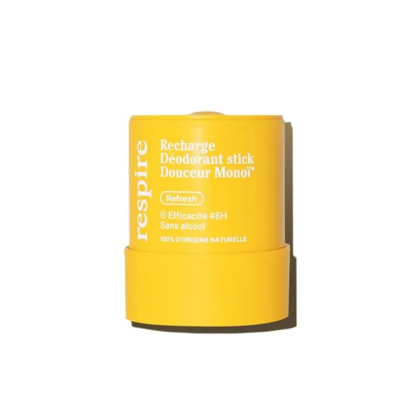 Le Déodorant Stick Douceur Monoï en format recharge de Respire offre une efficacité pendant 48h contre les mauvaises odeurs et l'excès d'humidité.
