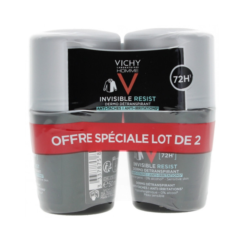 Vichy Homme Déodorant Invisible Resist Dermo-Détranspirant 72H Roll-On Lot de 2 x 50 ml est un déodorant détranspirant, anti-taches et anti-irritations, formulé spécialement pour les hommes.