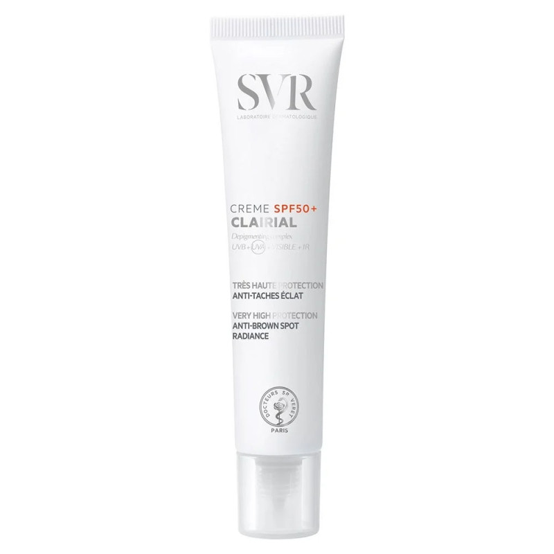 SVR Clairial Crème Solaire Anti-Taches SPF50+ 40ml est une crème solaire très haute protection solaire anti-taches. Pour tous les types de tâches liées au soleil, au vieillissement cutané, à la grossesse, aux imperfections, au teint irrégulier.