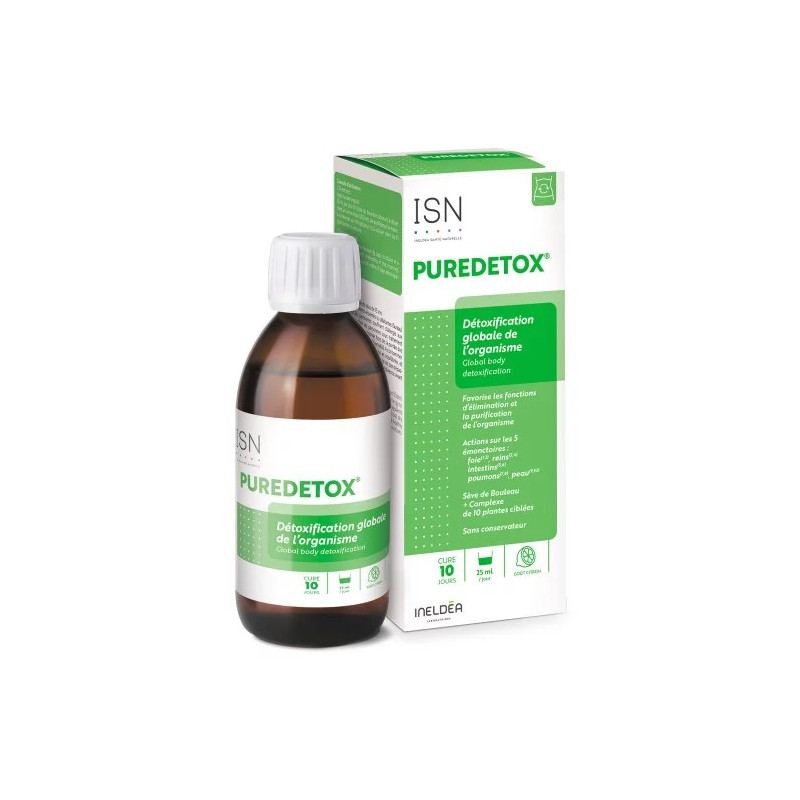 PUREDETOX® est un concentré purifiant à diluer à base de Sève de Bouleau, de Fibres Prébiotiques et d’un complexe synergique de 10 plantes ciblées pour agir sur les 5 émonctoires : le foie, les intestins, les reins, les poumons et la peau.