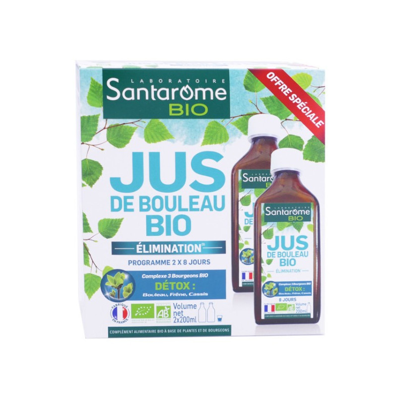 Les laboratoires Santarome Bio proposent Jus de Bouleau fortement dosé en feuilles de bouleau d'origine française : 4000mg et complété en trio de bourgeons bio détox (bouleau, frêne et cassis).