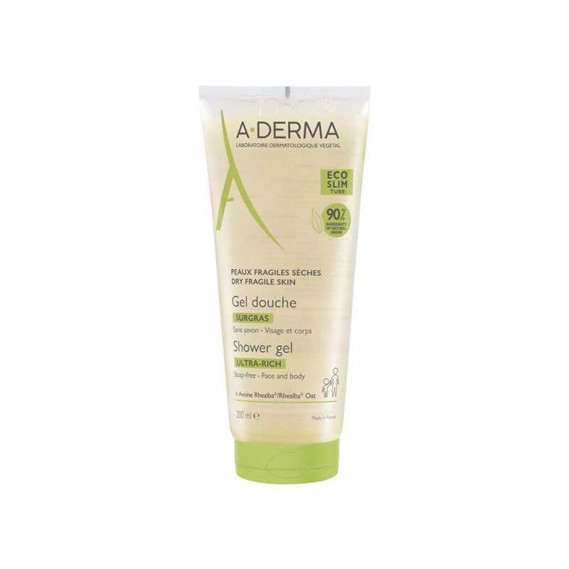 Biodégradable, A-Derma Les Indispensables Gel Douche Surgras 200ml est adapté à toute la famille et s’applique sur le visage et le corps.