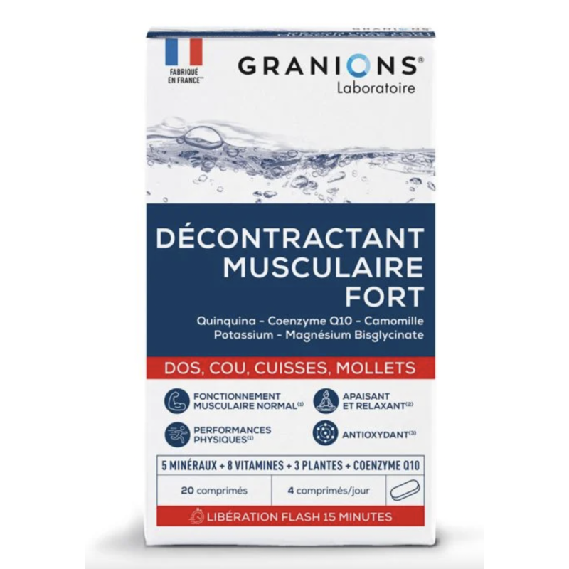 Granions décontractant musculaire est une formule complète possédant 4 Actions : Décontraction, Anti-douleur, Élimination des Toxines, Force Musculaire Complexe unique de 17 actifs avec un fort dosage en magnésium, sous forme bisglycinate, tolérance optimaleRenforcé en CoQ10, quinquina, vigne rouge. Prise en charge globale des contractures musculaires.