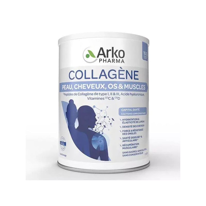 Peptides de collagène de type I, II et III - Acidifiant : acide citrique - Arôme naturel (goût orange) - Maltodextrine - Vitamine C - Colorant d'origine végétale : bêtacarotène - Hyaluronate de sodium - Édulcorant : sucralose - Vitamine D3.