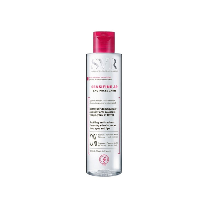 SVR Sensifine AR Eau Micellaire 200 ml est une eau micellaire qui permet de démaquiller et apaiser le visage, les lèvres et les yeux des peaux sensibles à rougeurs.