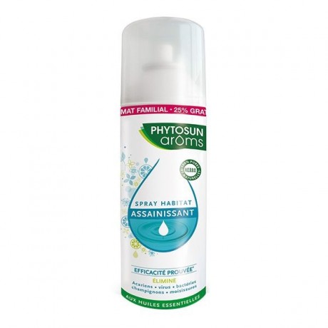 Spray Habitat Assainissant de PHYSTOSUN AROMS, un spray assainissant aux belles senteurs d'huiles essentielles pour l'intérieur de la maison. Le laboratoire PHYTOSUN AROMS propose des produits d'aromathérapie à base d'huiles essentielles pour retrouver bien-être et confort au quotidien. Le spray Habitat Assainissant de PHYSTOSUN AROMS agit rapidement pour rendre une pièce pure et agréablement parfumée aux huiles essentielles naturelles Botaniquement et Biochimiquement Définies (H.E.B.B.D) (25%). En plus de donner à la pièce une sensation de bien-être, il désinfecte en 5 minutes et lutte contre les acariens, les bactéries (les souches E.col, Staphylocoque, Streptocoque...), les moisissures (Candida albicans et Aspergillus niger), les virus respiratoires ainsi que les champignons. L'air est sain et agréablement parfumé.