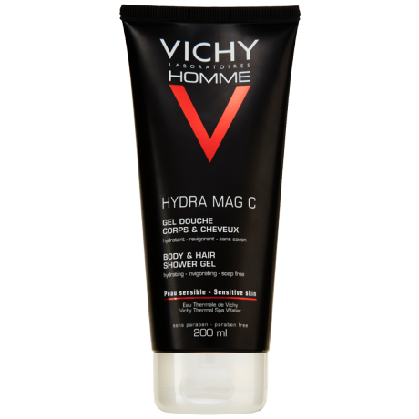 Vichy Homme MAG-C Gel Douche Hydratant Revigorant 200 ml, formulé au pH physiologique cutané, permet un nettoyage quotidien. Sa formule sans savon, enrichie en agent hydratant, limite le dessèchement cutané.
