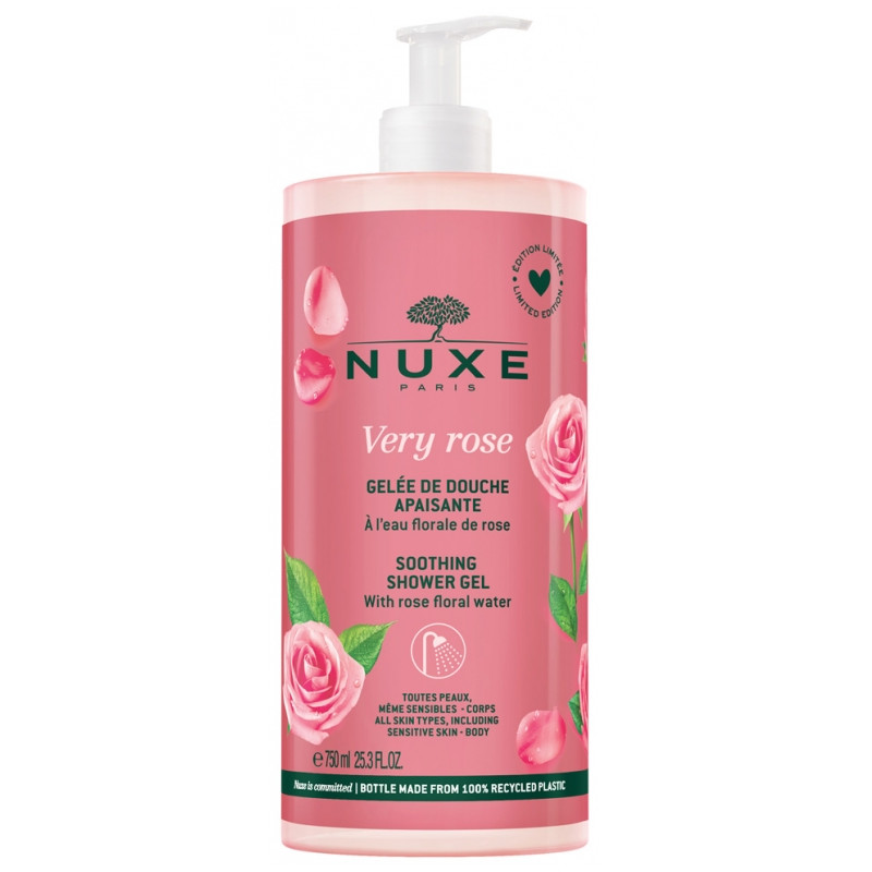 Nuxe Very rose Gelée de Douche Apaisante 750 ml est une base lavante végétale ultra-douce. Elle nettoie et apaise la peau sans l'assécher, la parfumant de délicates notes de rose.