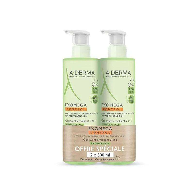A-Derma Exomega Control Gel Lavant Émollient Anti-Grattage 2 en 1 Lot de 2 x 500ml est idéal pour nettoyer, apaiser et protéger la peaux des bébés et des enfants grâce à sa formule sans savon et ph physiologique.