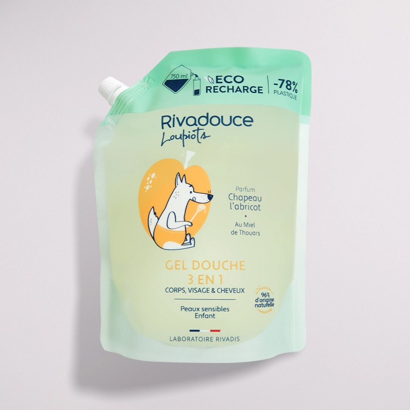 Le Gel douche 3 en 1 Chapeau l’abricot nettoie, hydrate et protège le visage, le corps et les cheveux des petis loups !