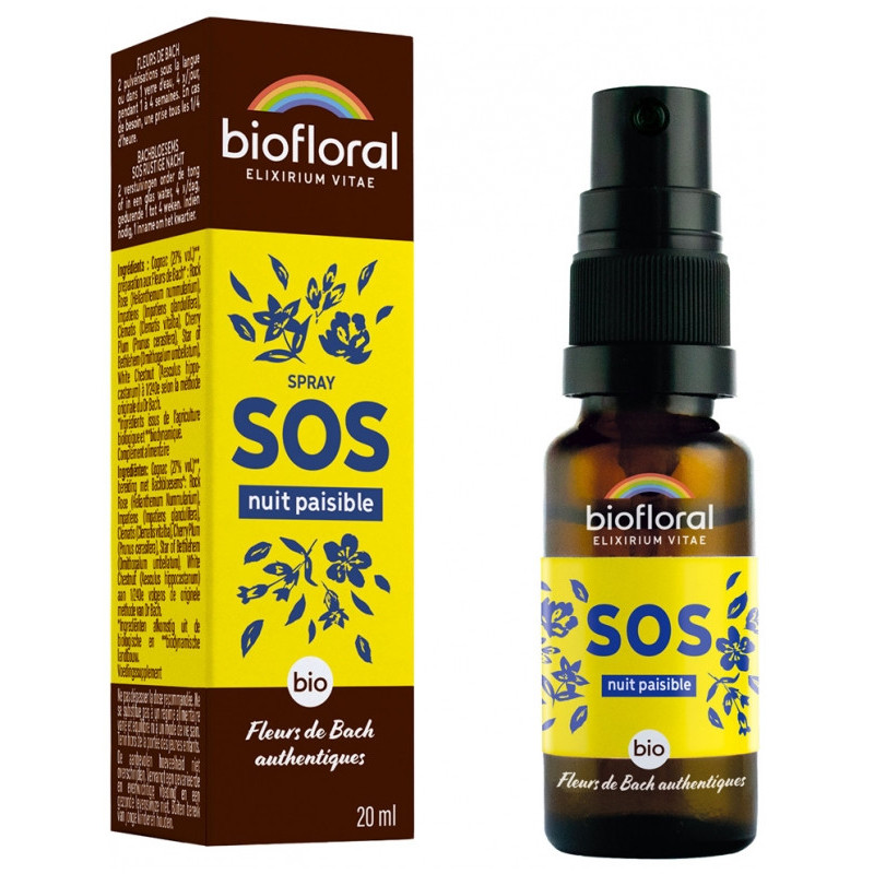 Biofloral Fleurs de Bach Spray SOS Nuit Paisible Bio 20 ml est un complément alimentaire indiqué pour les difficultés à trouver le calme, la sérénité ou un sommeil profond. Il apporte calme et sérénité et favorise un sommeil profond et détendu.
