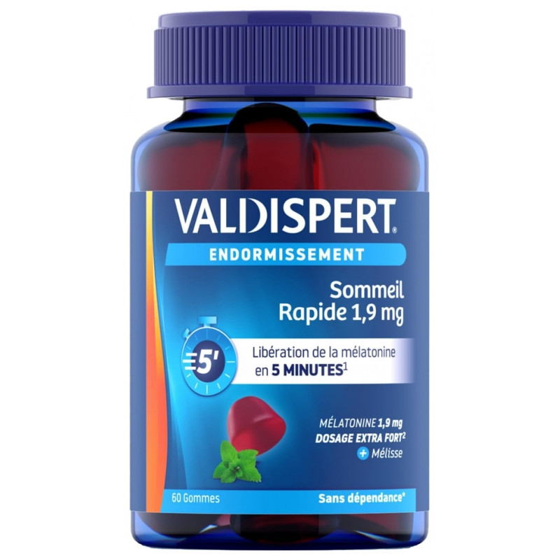 Valdispert Sommeil Rapide 1,9 mg 60 Gummies est un complément alimentaire spécialement conçu pour favoriser un endormissement plus rapide. Il contient un mélange unique de mélatonine et de mélisse dans une gomme au bon goût fruits rouges.
