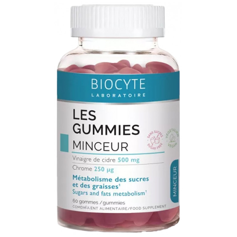 Biocyte Les Gummies Minceur 60 Gummies est un complément alimentaire à base de vinaigre de cidre de pomme, vitamines, grenade, chrome, avec édulcorant.