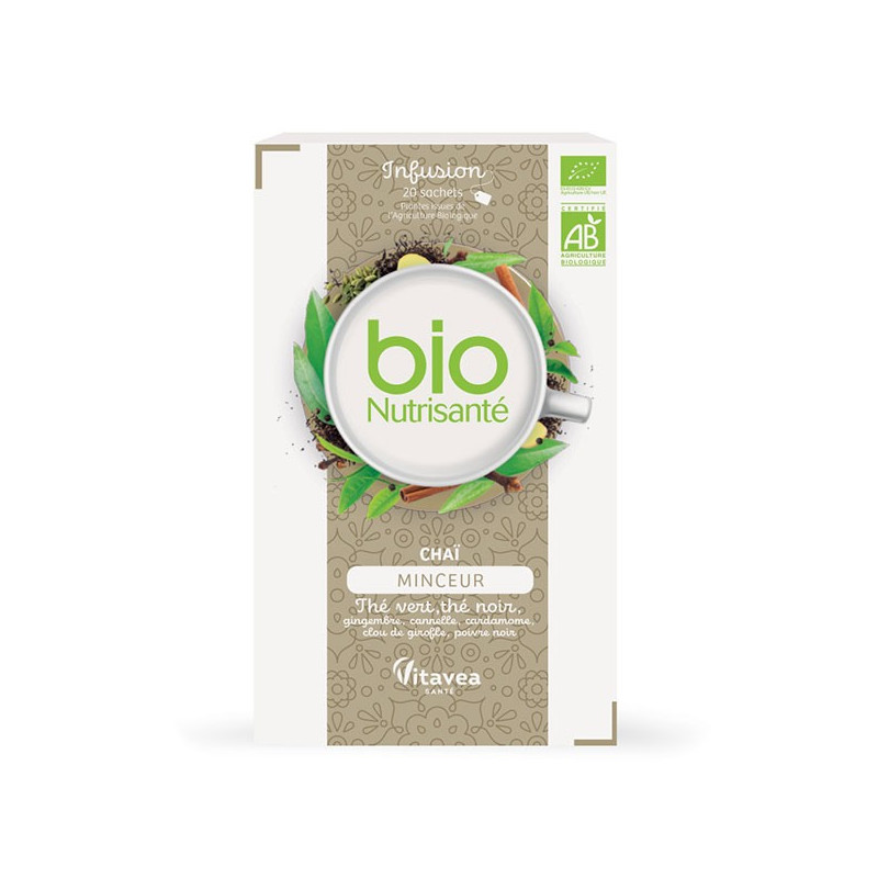 L'Infusion Minceur Bio est un produit du laboratoire Nutrisanté à base de Thé Noir, Thé Vert, Gingembre, Cannelle, Cardamome, Clou de Girofle et Poivre Noir.