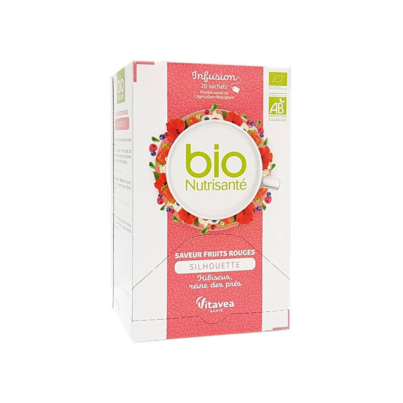 L'Infusion Silhouette Bio est un produit du laboratoire Nutrisanté à base de Reine des Près et d'Hibiscus, à l'arôme naturel de Fruits Rouges.