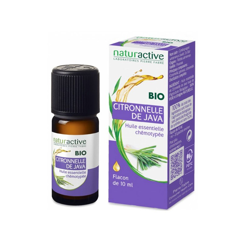 Huile Essentielle Citronnelle de Java Bio 10ml est un complément alimentaire du laboratoire Naturactive à base d'huile essentielle issue de parties aériennes de Citronnelle de Java (Cymbopogon winterianus Jowitt Ex Bor), issue de l'agriculture biologique.