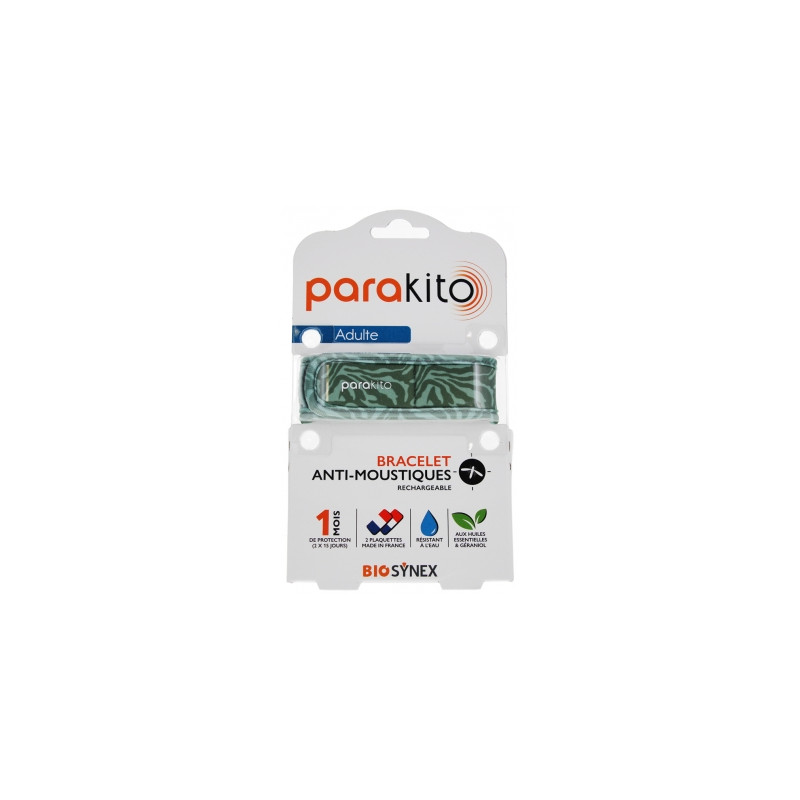 Parakito Bracelet Anti-Moustiques Rechargeable Adulte est un équipement biocide anti-moustiques aux huiles essentielles et géraniol.