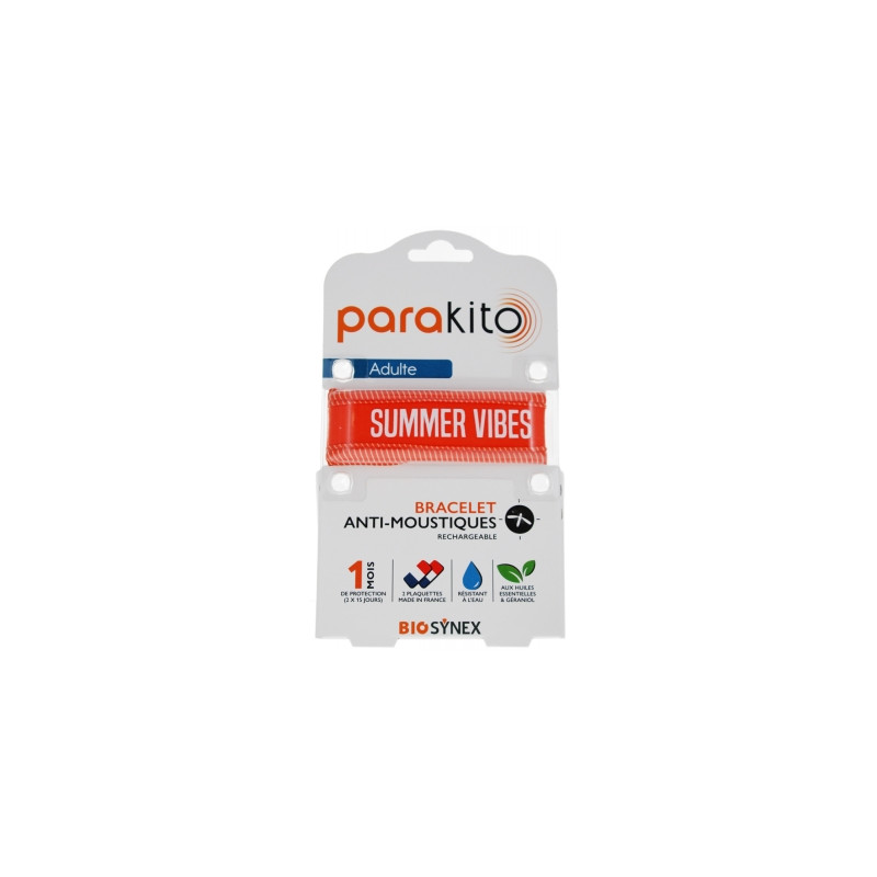 Parakito Bracelet Anti-Moustiques Rechargeable Adulte est un équipement biocide anti-moustiques aux huiles essentielles et géraniol.