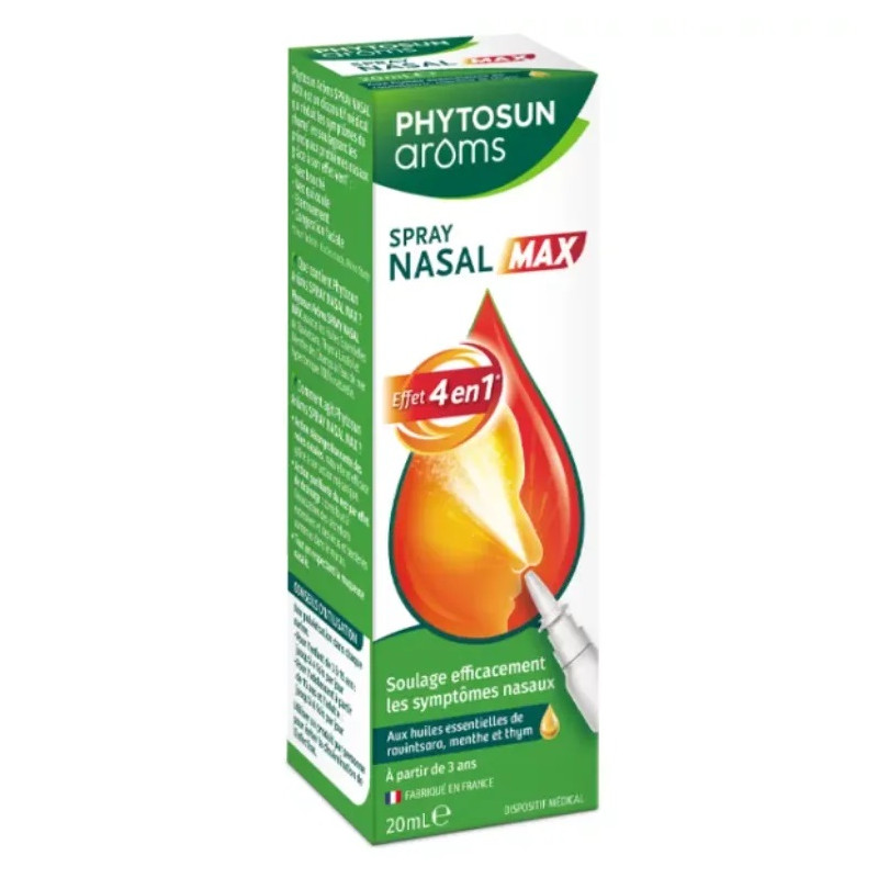 Spray Nasal Max de Phytosun aroms est un spray permettant de soulager les symptômes du rhume : nez qui coule, nez bouché, éternuement, congestion faciale grâce à son action 4en1.