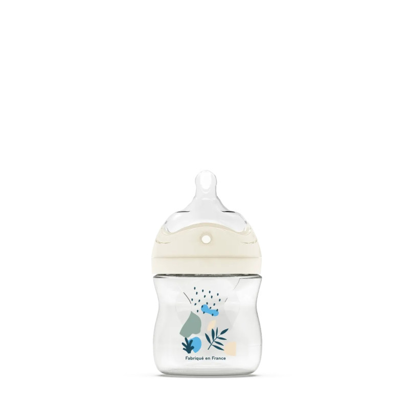 Le biberon a un débit 1 avec des perforations multiples pour reproduire les canaux lactifères du sein.
