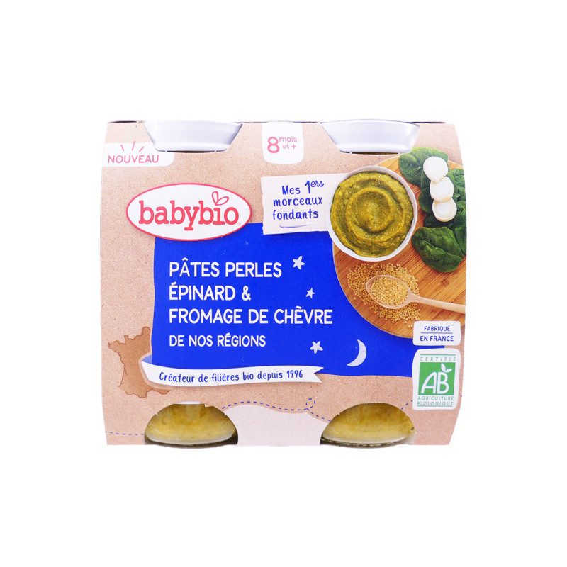 Les Petits pots Repas Bébé Soir Pâtes perles Epinard et Fromage de Chèvre Bio pas cher de BABYBIO, un menu pour le dîner pour faire découvrir aux tout-petits de nouvelles saveurs ! A partir de 8 mois. Dans votre parapharmacie en ligne à prix pas cher.
