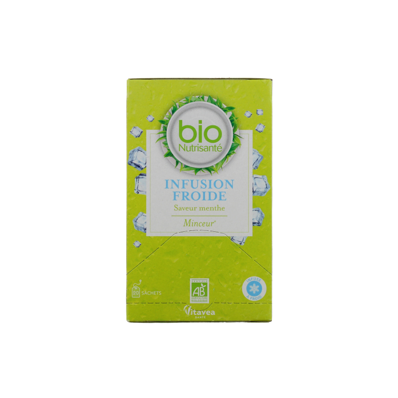 Infusion froide minceur Bio de Nutrisanté, agit en facilitant le contrôle du poids grâce à la combustion des graisses favorisée par le thé vert, tout en facilitant la digestion avec la présence de menthe douce.