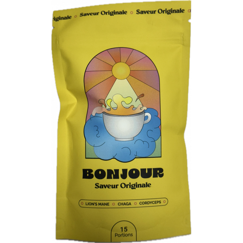 Bonjour est une alternative naturelle au café sans gluten au goût irrésistible et élaborée à partir d'un mélange unique enrichi en champignons. Tous les ingrédients ont été soigneusement sourcés auprès de producteurs indépendants et favorisant un circuit court. Notre recette offre énergie durable et clarté mentale, sans les effets négatifs du café traditionnel (maux de ventre, anxiété, palpitations, coloration des dents, brouillard mental, coups de fatigue,...).