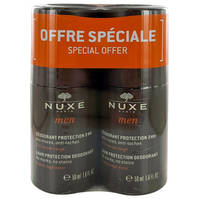 Nuxe Men Déodorant Protection 24H Lot de 2 x 50 ml est un déodorant roll-on anti-taches et anti-traces qui assure une protection 24H.
