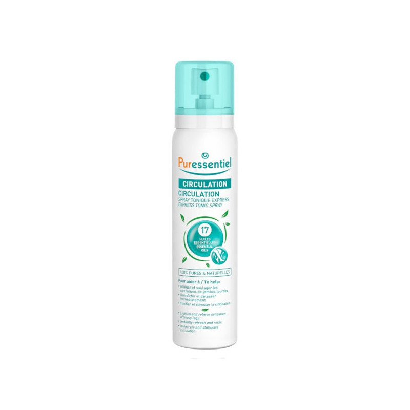 Enrichie en menthol naturel, Puressentiel Circulation Spray Tonique aux 17 Huiles Essentielles 100ml rafraîchit, allège et soulage les jambes fatiguées et lourdes.