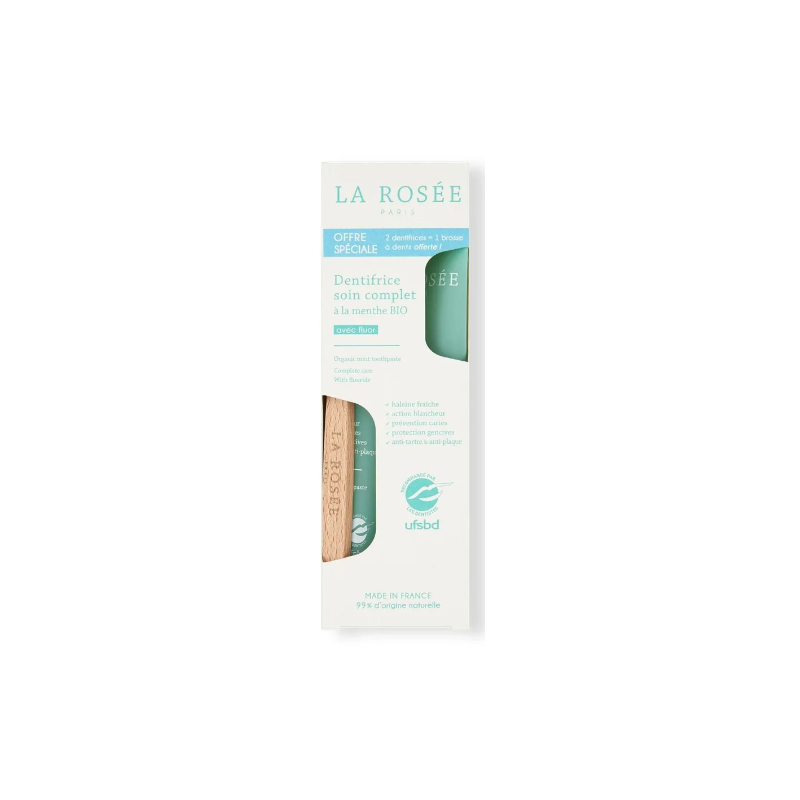 Ce duo de dentifrices s'accompagne d'une brosse à dents offerte. Fabriquée en France, elle se compose d’un manche en bois issus de forêts françaises éco-gérées, et de poils souples bleus ciel et verts pâles, biosourcés pour un brossage à la fois doux et efficace.