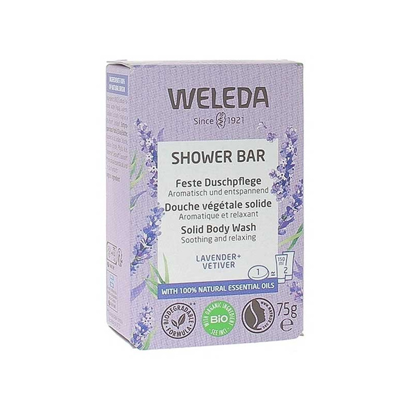Profitez d’un moment de détente grâce aux accords relaxants de Lavande aromatique et de Vétiver boisé de Weleda Shower Bar Douche Végétale Solide Lavander & Vétivier Bio 75g.