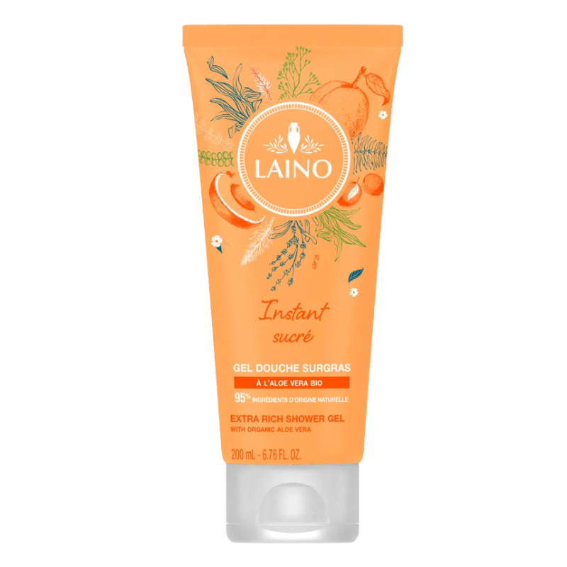 Le Gel Douche Surgras Instant Sucré à l'Aloe Vera Bio de Laino est un soin lavant délicatement parfumé à l'abricot qui nettoie en douceur la peau tout en l'hydratant. Sa formule nourrissante enrichie en Aloe Vera Bio est parfaite pour les peaux sèches et déshydratées qui ont besoin de retrouver souplesse et douceur.