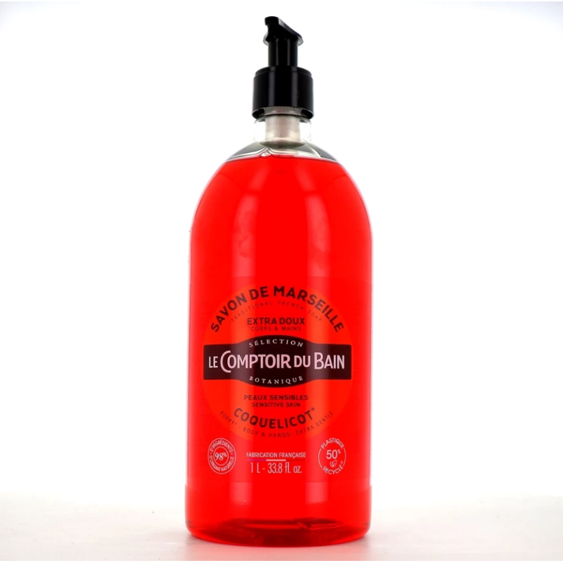 Le savon de Marseille liquide proposé par la marque Le Comptoir du Bain est un nettoyant corps et mains qui convient à tous les types de peau, même sensibles. Proposé en diverses senteurs, il favorise la détente et l'évasion.
