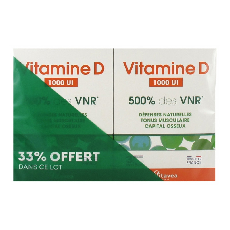 Vitavea Vitamine D 1000 UI Lot de 2 x 90 Comprimés est un complément alimentaire à base de vitamine D. La vitamine D participe au maintien des défenses naturelles et joue un rôle dans le processus de la division cellulaire de l'organisme. De plus, elle contribue à l'absorption du calcium et du phosphore : 2 minéraux essentiels pour la structure des os et des dents. Le capital osseux du corps est ainsi entretenu.