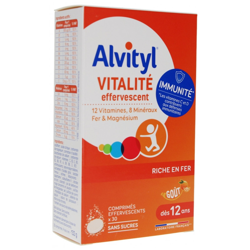 Alvityl Vitalité 30 Comprimés Effervescents est un complément alimentaire dont la formule associe 12 vitamines et 10 minéraux spécialement dosés pour couvrir 100% des valeurs nutritionnelles de référence en vitamines pour :