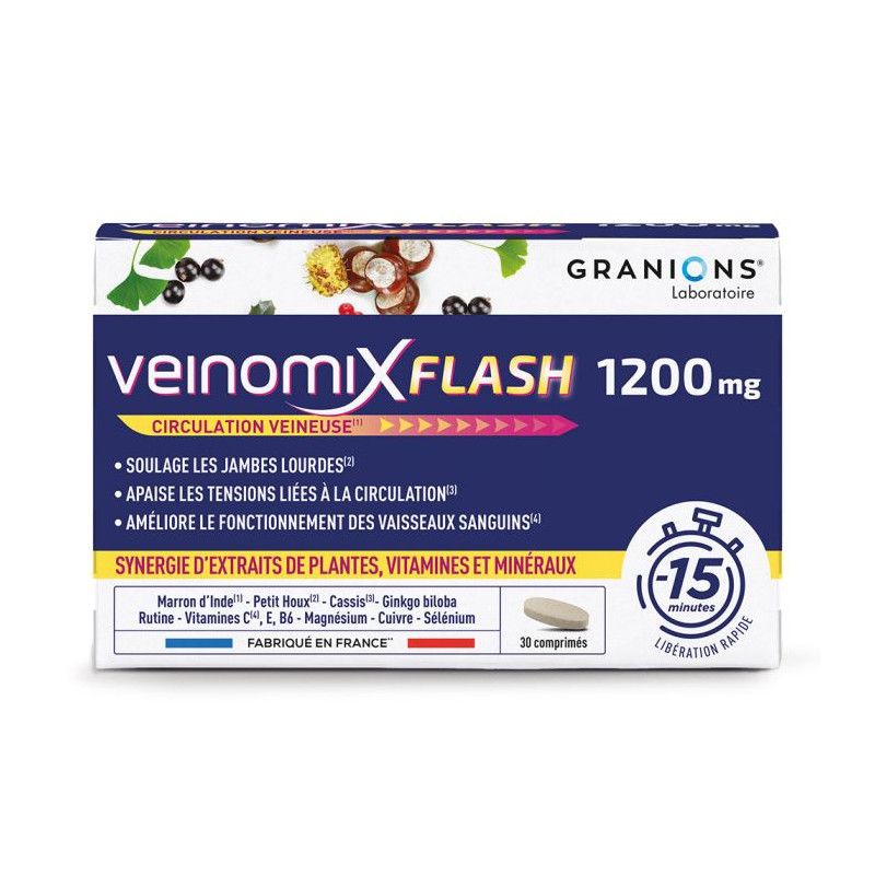 VEINOMIX FLASH 1200 mg est une association unique de 11 plantes, vitamines et minéraux rigoureusement sélectionnés pour favoriser la circulation veineuse grâce à ses 6 actions ciblées :