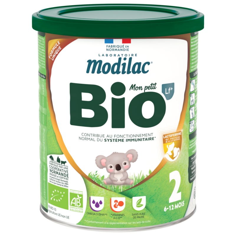Choisir Modilac Bio 2 Lf+, c’est choisir une formule infantile biologique fabriquée en France, avec une sélection de matières grasses végétales biologiques sans huile de palme. La certification Bio vous garantit une traçabilité rigoureuse des ingrédients biologiques tout au long de la chaîne, pour faire bénéficier votre enfant des bienfaits d’une agriculture respectueuse de l’environnement.