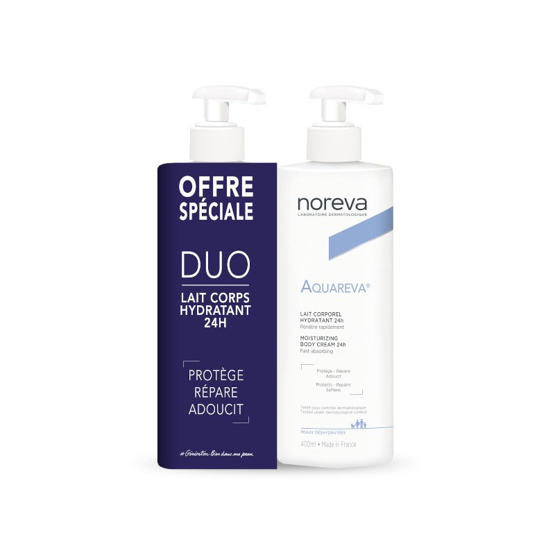 Noreva Aquareva Lait Corporel Hydratant 24H Lot de 2 x 400 ml répare, protège et apaise les peaux déshydratées des bébés, enfants, adultes.
